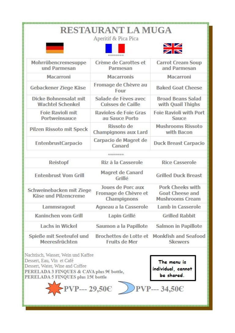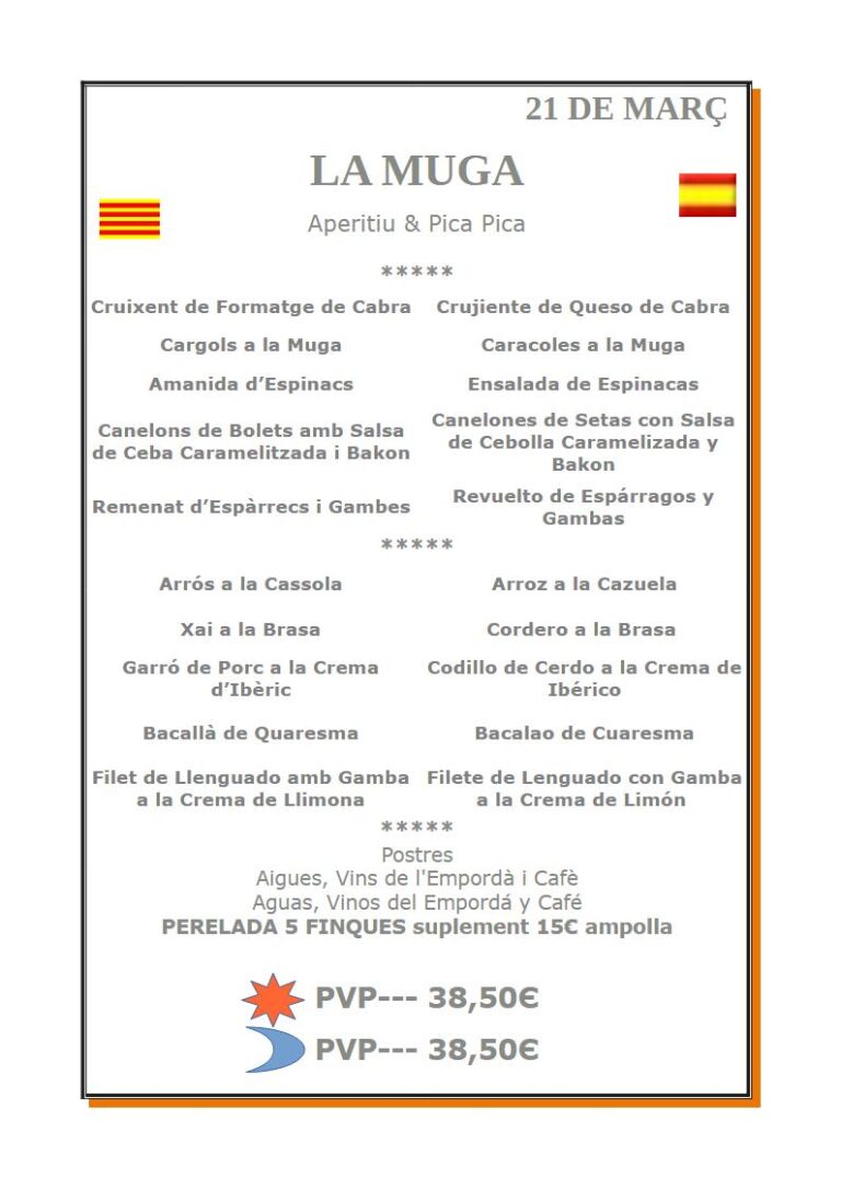 📞  972 673 296                         📩  restaurantlamuga@gmail.com                        📍  Situación                        🕘  13-00, 15:30 i 20:00 a 22:30
