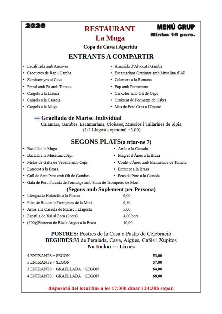 📞 972 673 296 📩 restaurantlamuga@gmail.com 📍 Situació 🕘 13-00, 15:30 i 20:00 a 23:00